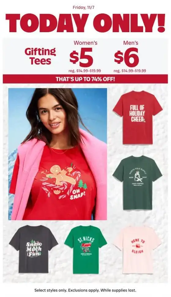 Offer valid 11/7/25 at Old Navy stores in the United States (including Puerto Rico) and at Old Navy online. Excludes Clearance, items sold and shipped by third parties & Maternity. Select styles only. While supplies last. No adjustments on previous purchases. Cannot be combined with other offers or discounts, including Gap Inc. employee discount.