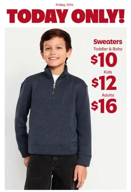 Today only! Shop in store and get $16 sweaters for adults, $12 for kids, & $10 for toddlers & babies.